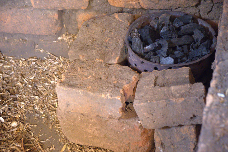 At the start, the chicks live in the smallest section to the right. A "biochar" heater is placed in the corner to the keep the chicks warm overnight, and the roofing material helps distribute and retain the heat. After two weeks, they move to the medium-sized section.